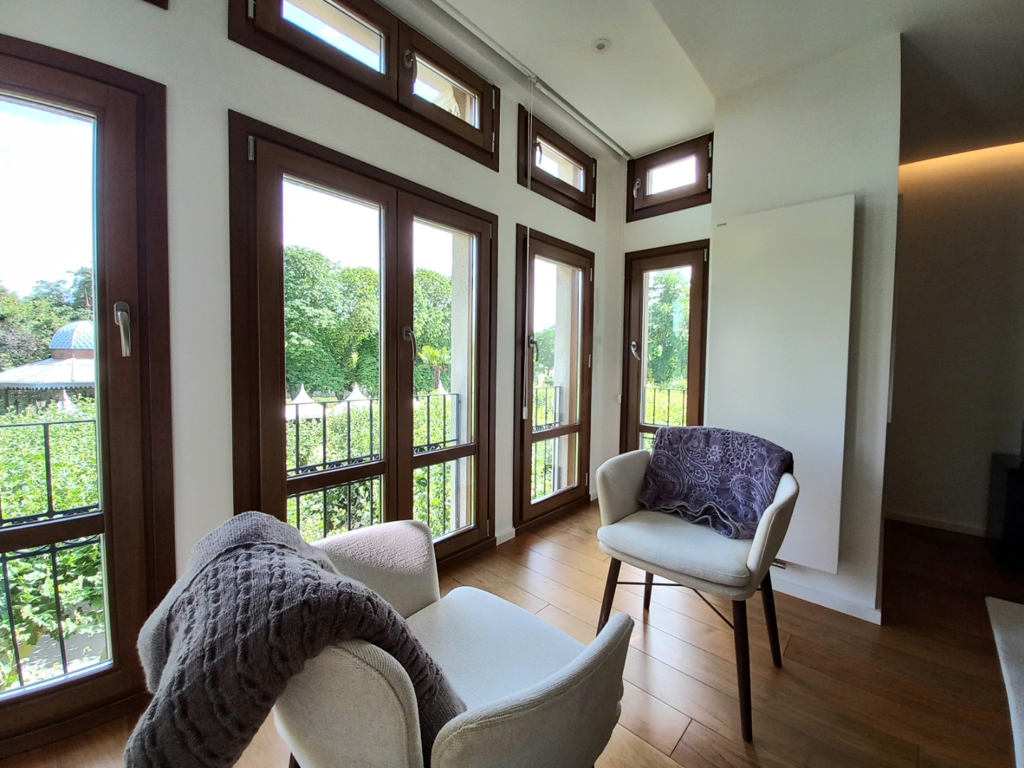 Sus amplios ventanales y las paredes blancas reflejan la luz natural, creando una atmósfera de serenidad.