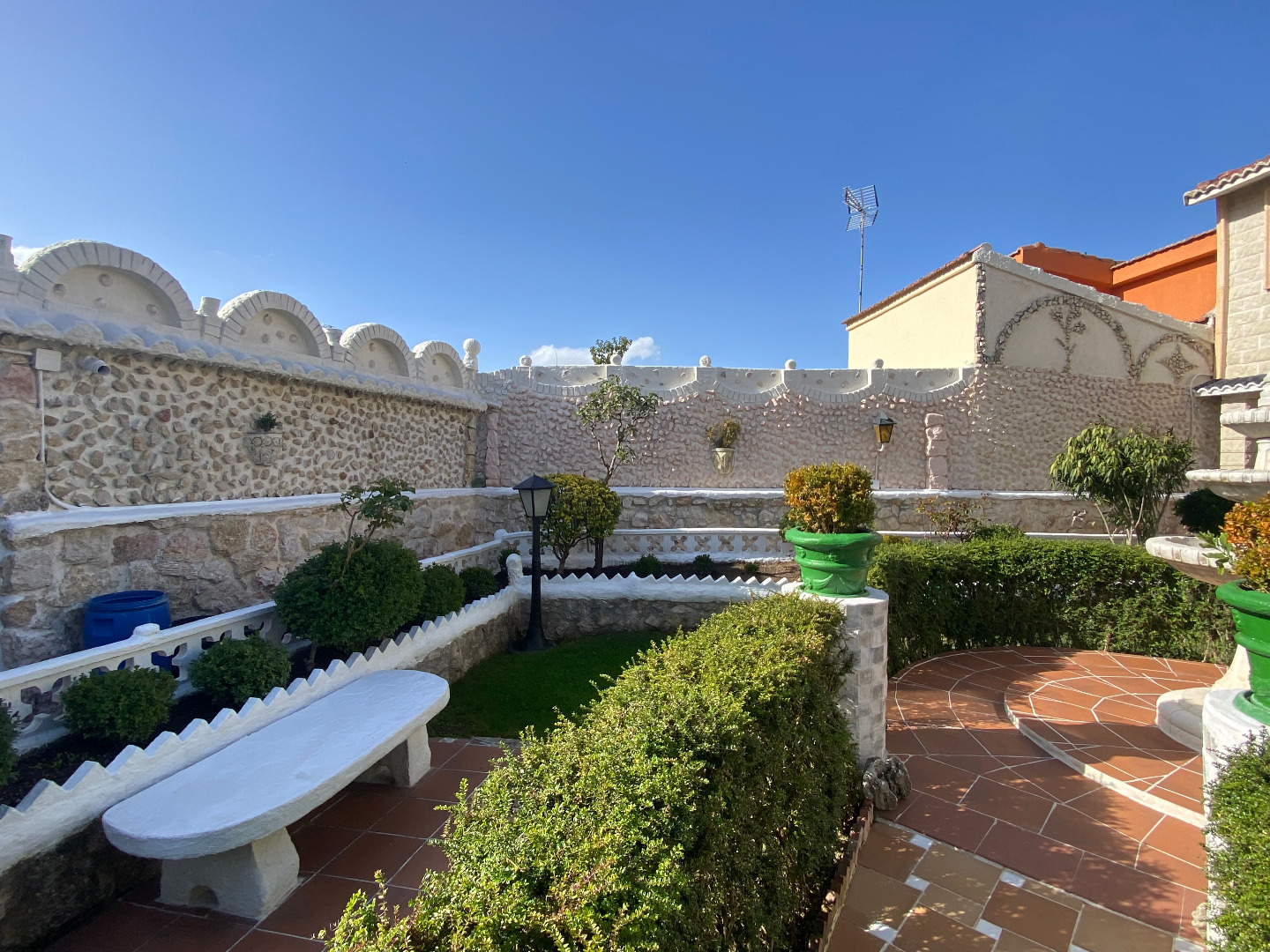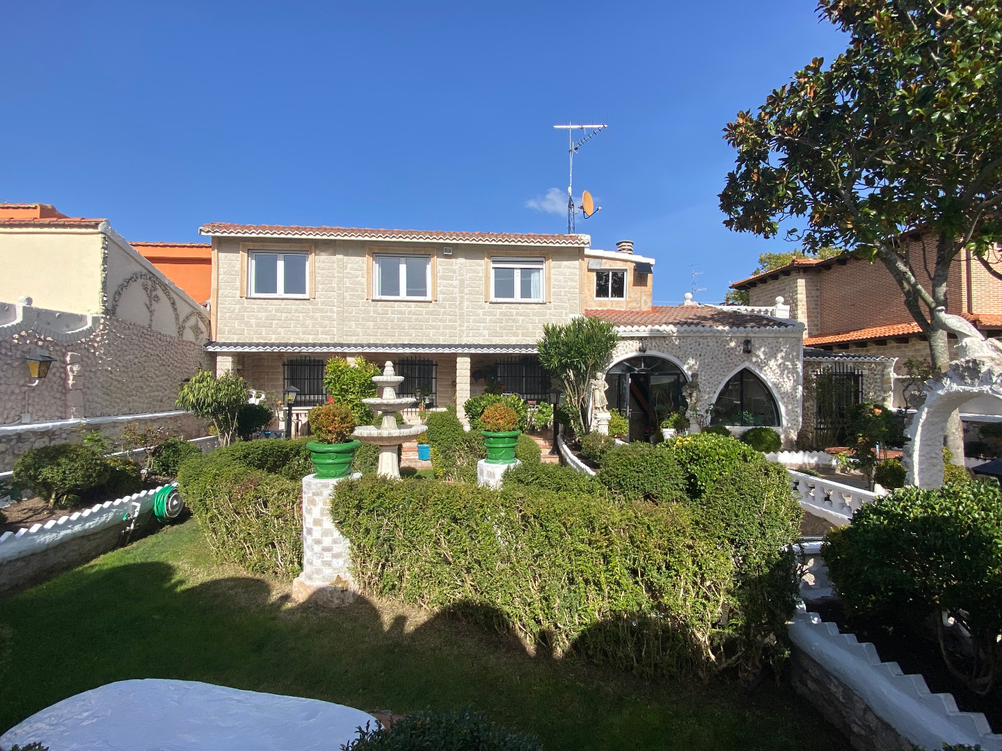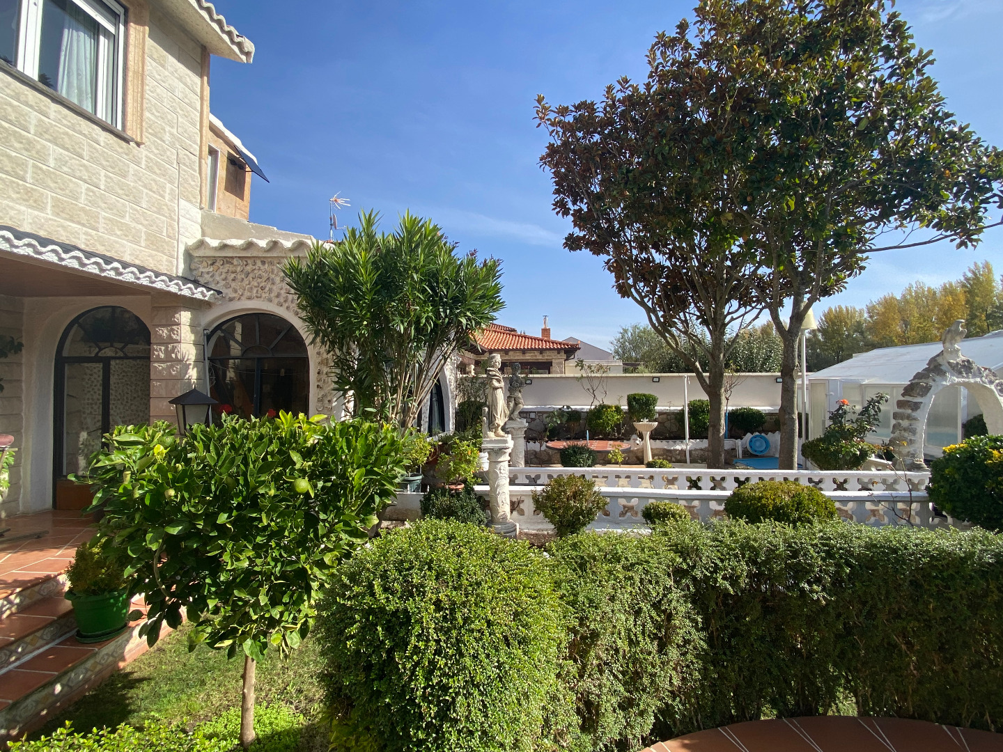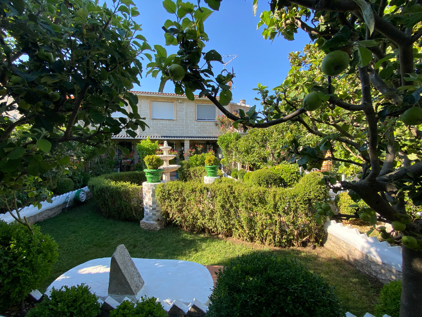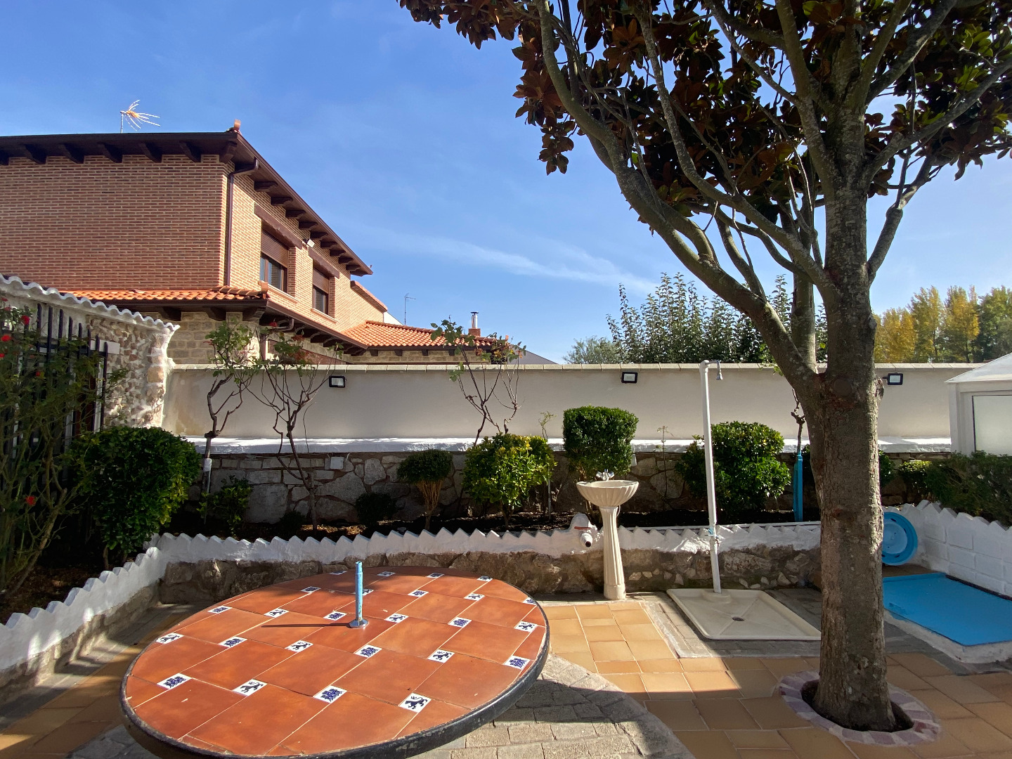 Jardín con diferentes árboles frutales, rosales, fuentes, pilas y piscina cerrada con depuradora