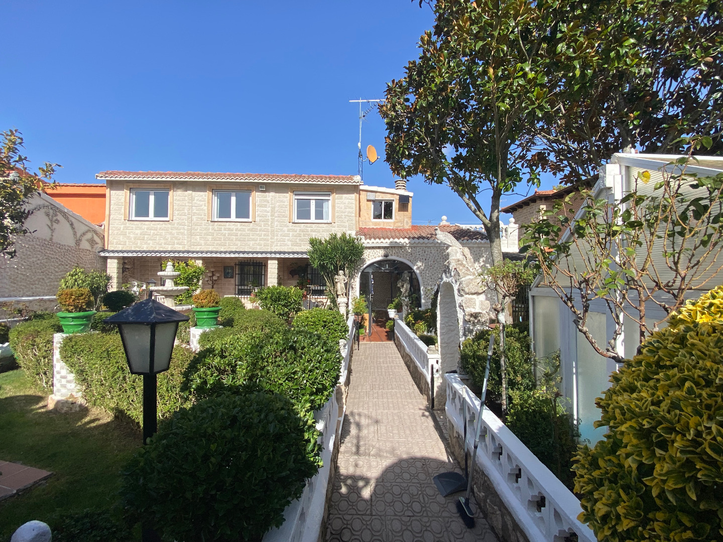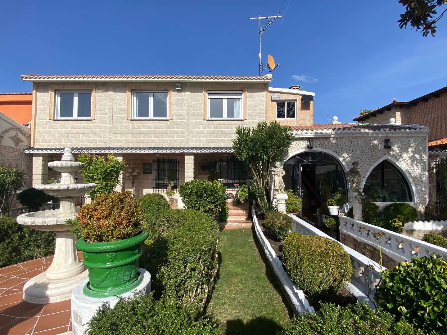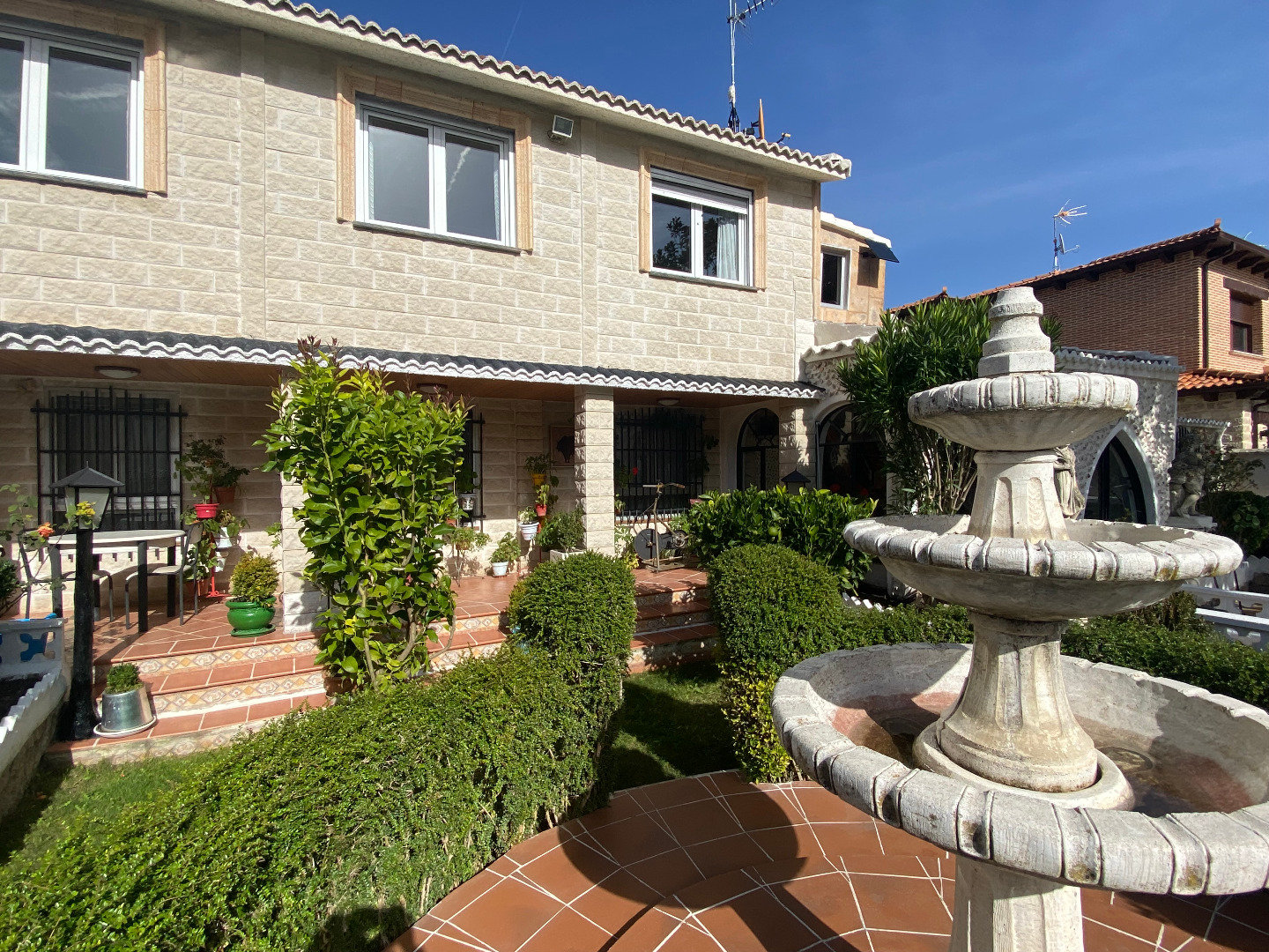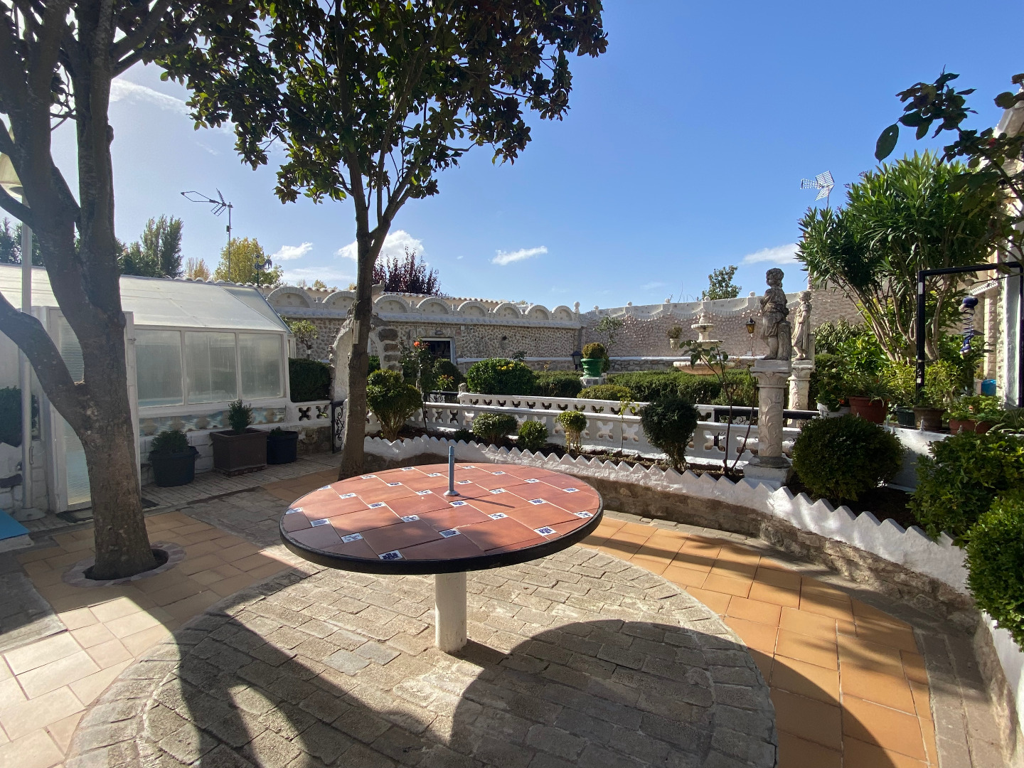 Jardín con diferentes árboles frutales, rosales, fuentes, pilas y piscina cerrada con depuradora