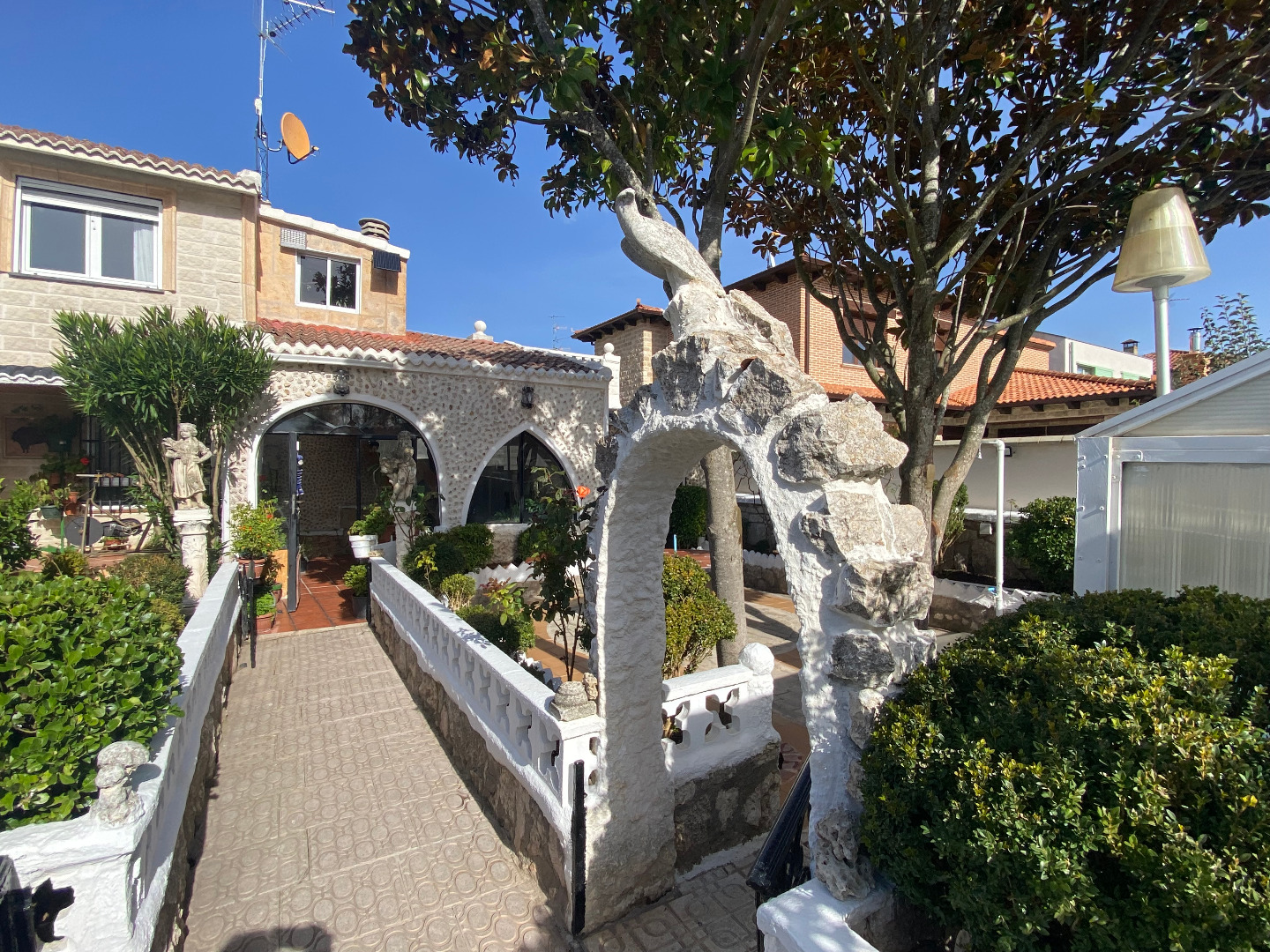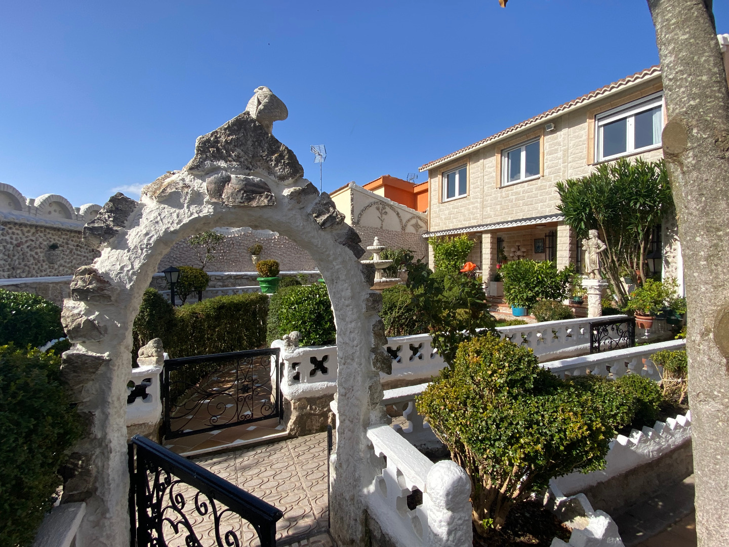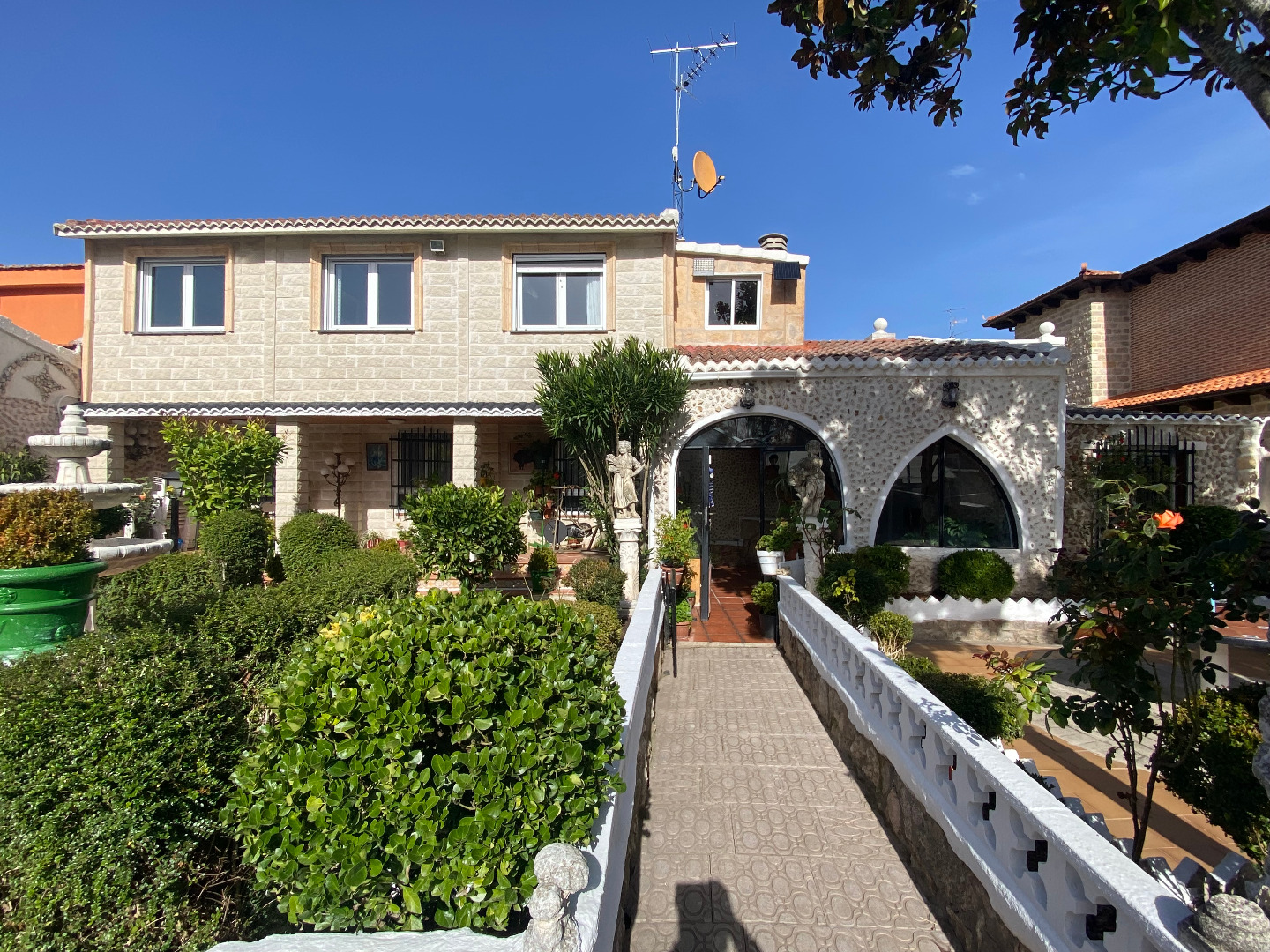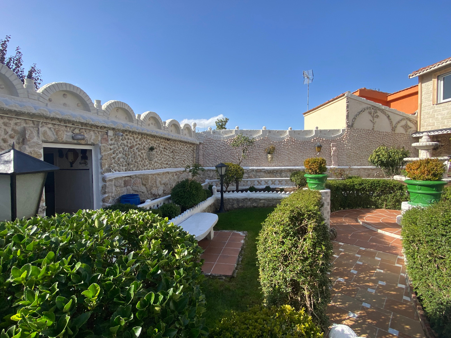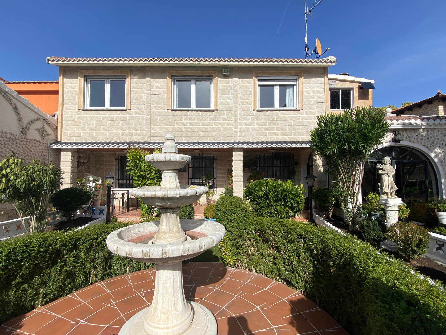 Jardín con diferentes árboles frutales, rosales, fuentes, pilas y piscina cerrada con depuradora