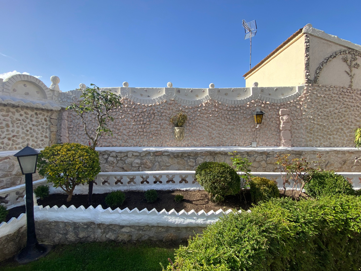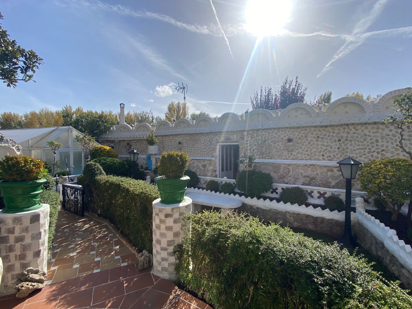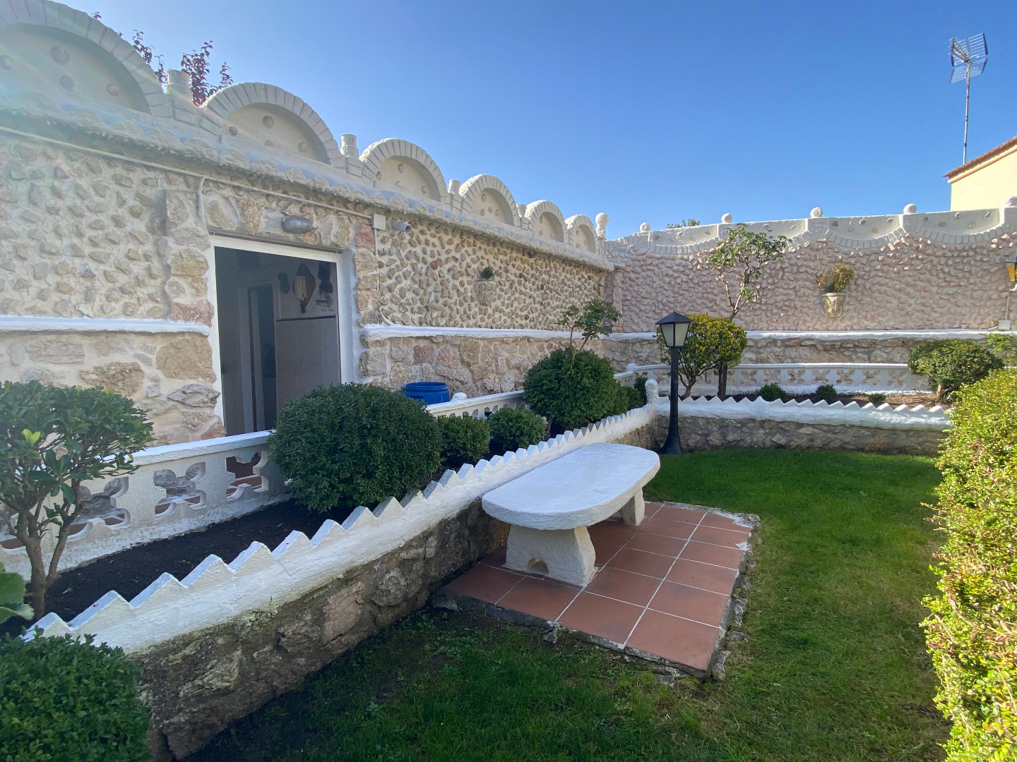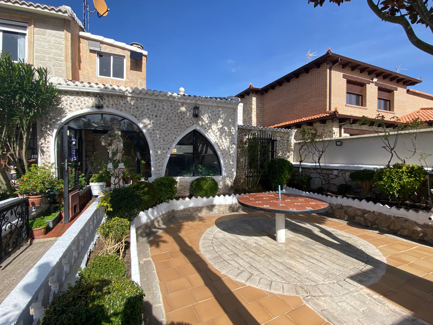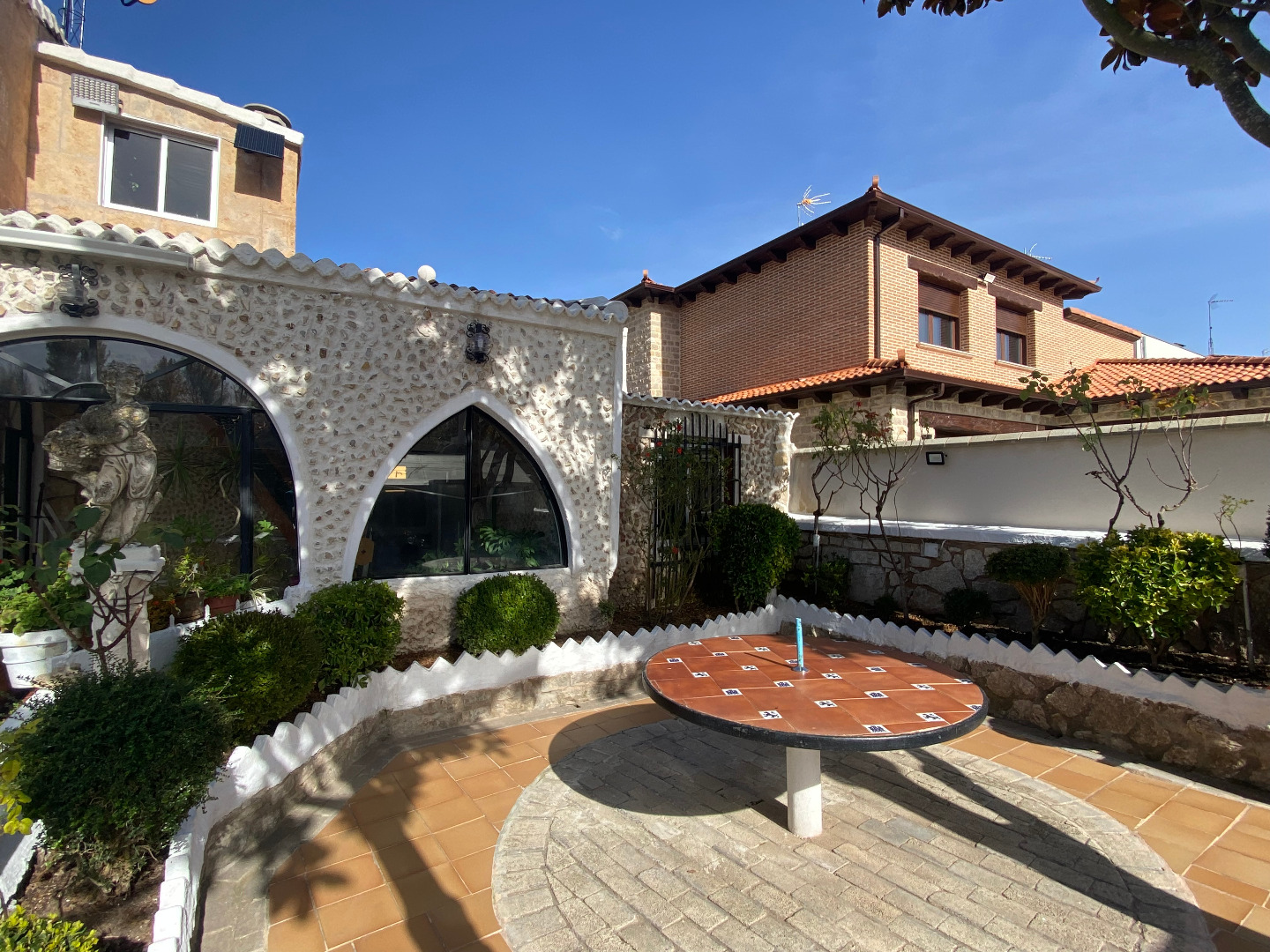 Jardín con diferentes árboles frutales, rosales, fuentes, pilas y piscina cerrada con depuradora
