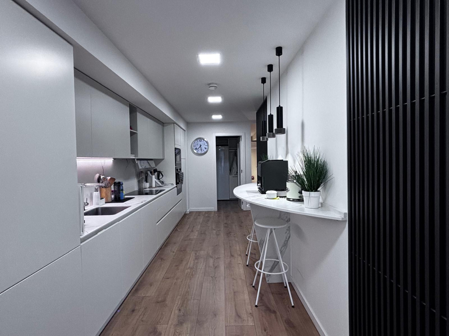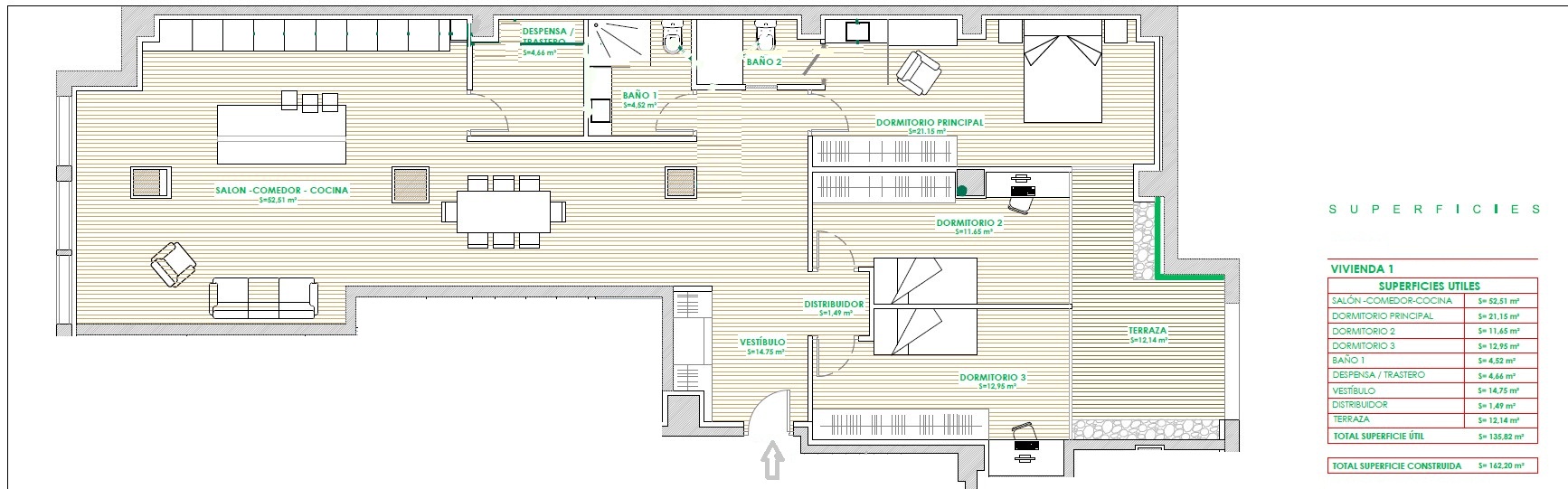Cuenta con un vestíbulo de casi 15m2 para dar acceso a un fabuloso salón-comedor-cocina de 52m2.