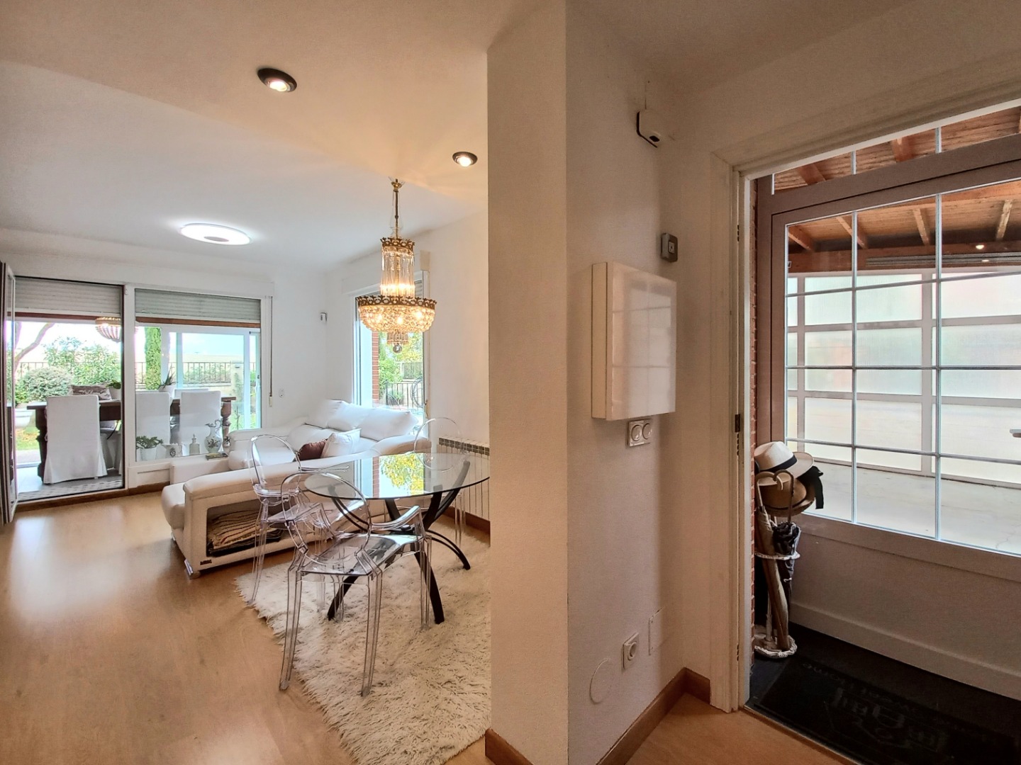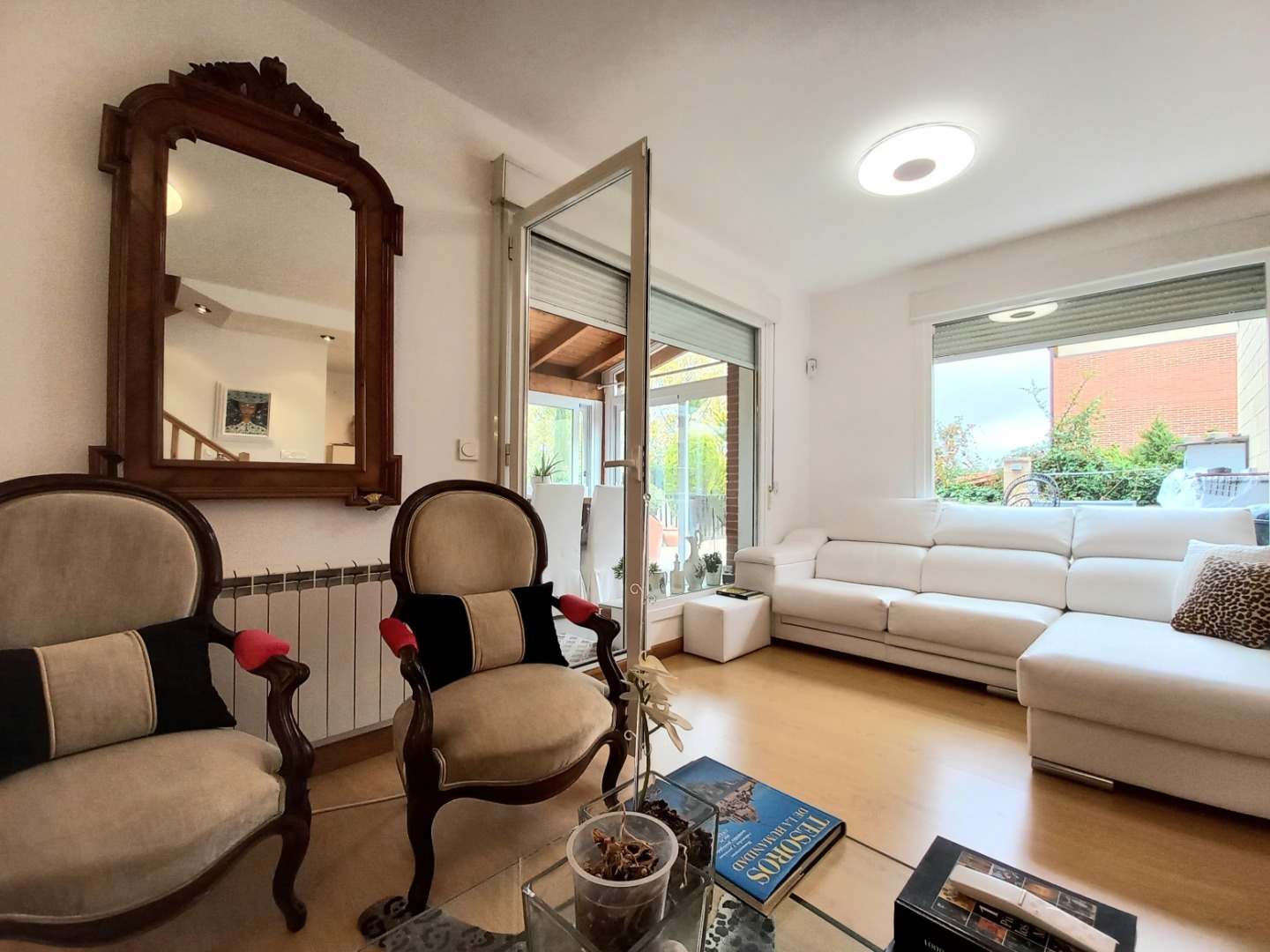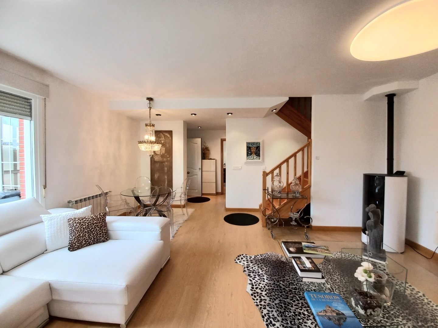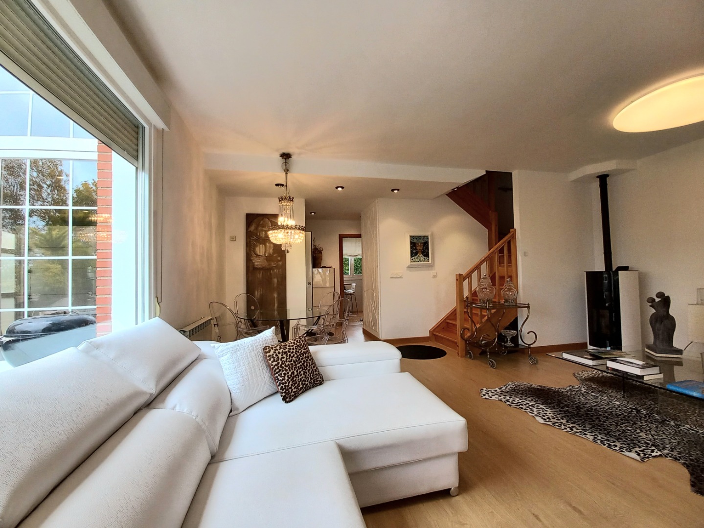 En la planta principal, un recibidor central al que se accede desde un práctico porche acristalado, organiza el espacio. Aquí se encuentran el salón comedor con una chimenea de pellets, una cocina totalmente equipada con electrodomésticos de alta gama, office y aseo. Desde el salón pasaremos a su estupendo porche principal, ideal para disfrutar de inolvidables veladas.