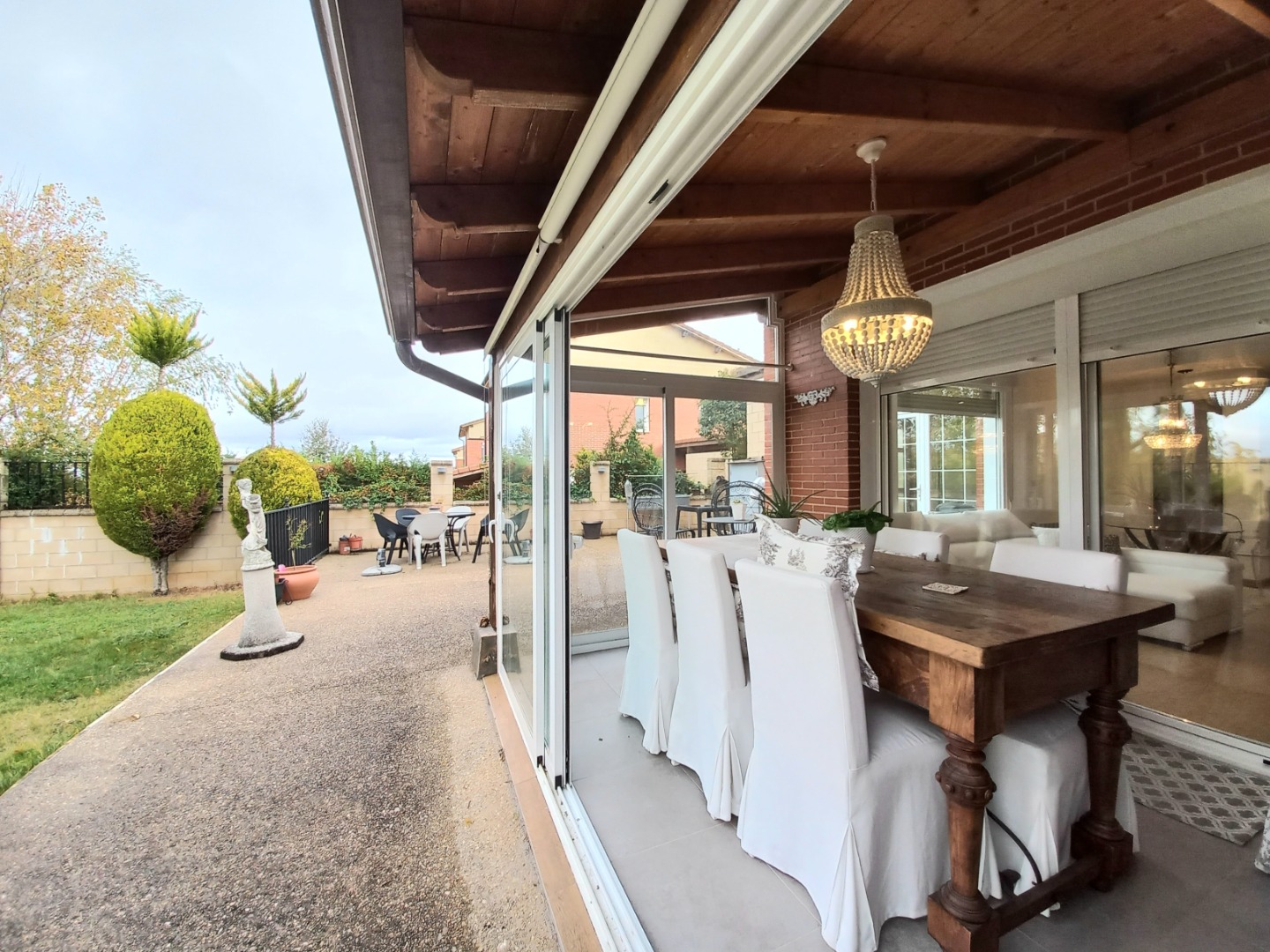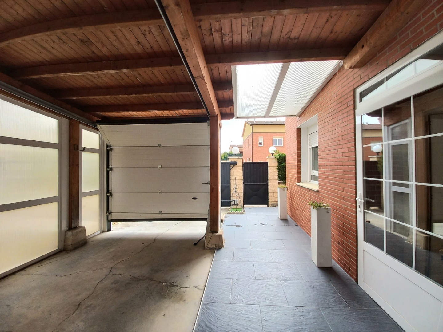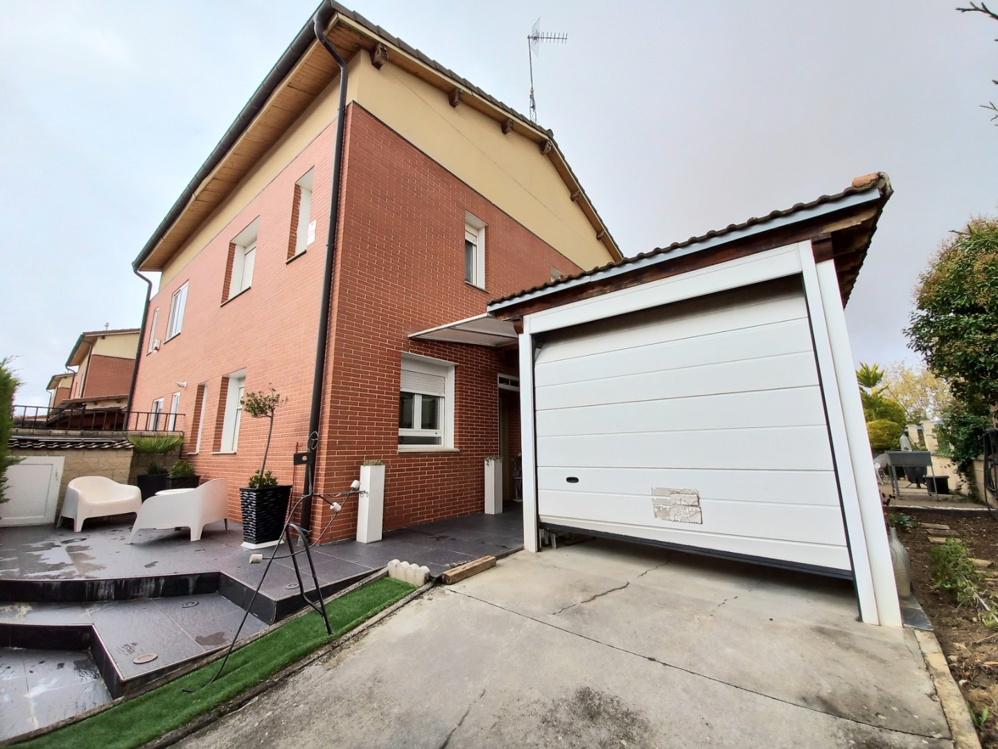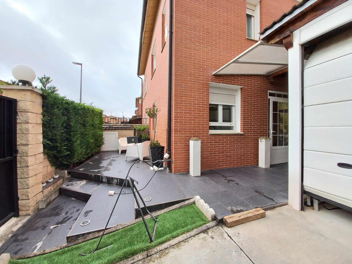 El exterior de la propiedad incluye un garaje privado techado con capacidad para dos vehículos y un maravilloso jardín con instalación de riego automático.