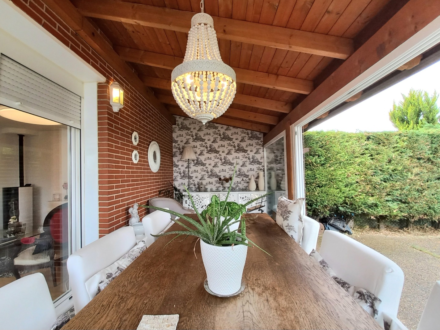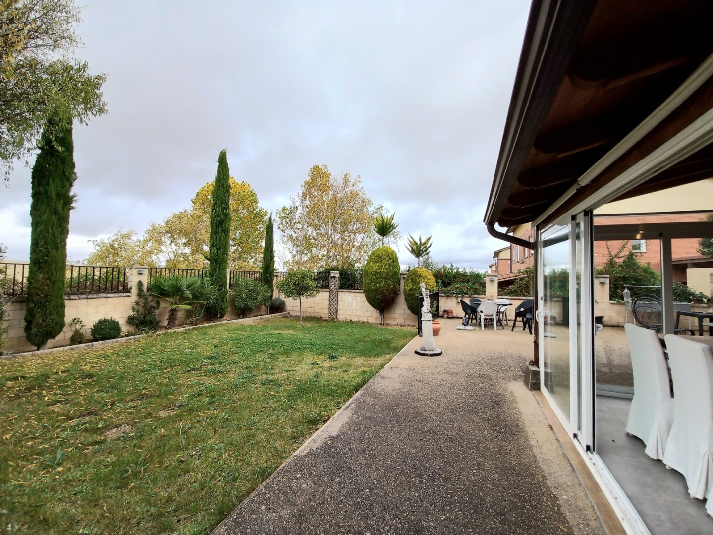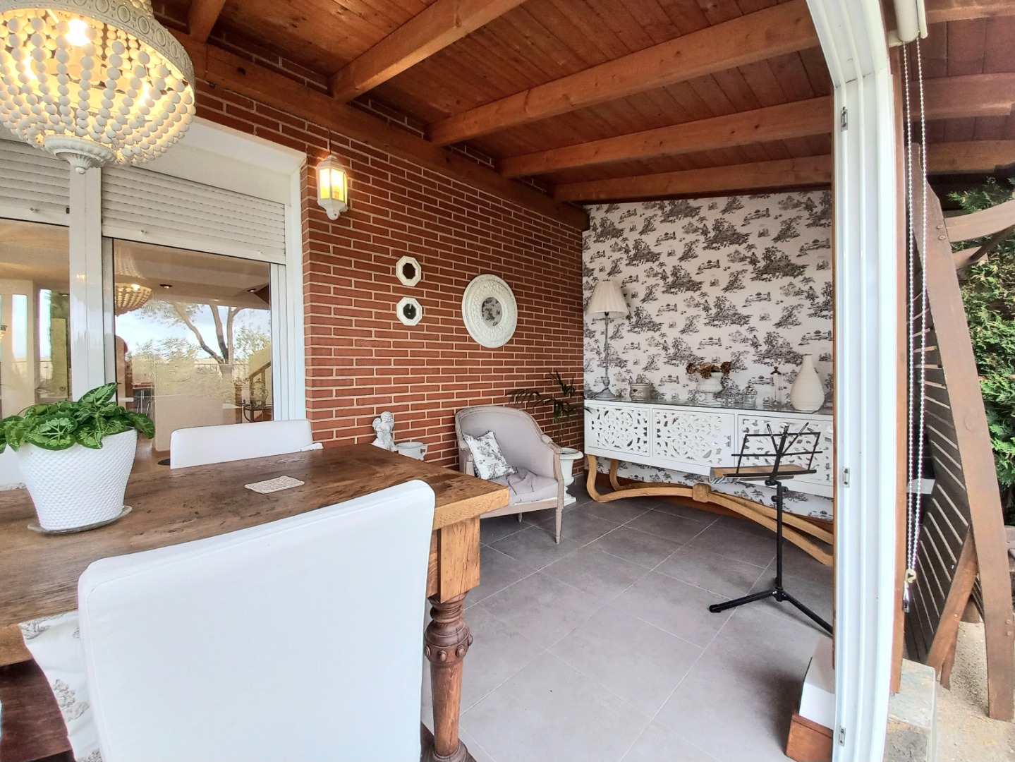 El exterior de la propiedad incluye un garaje privado techado con capacidad para dos vehículos y un maravilloso jardín con instalación de riego automático.