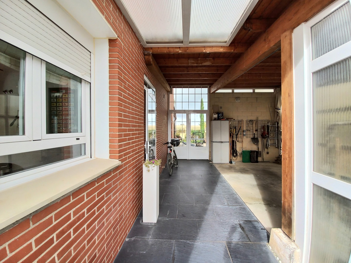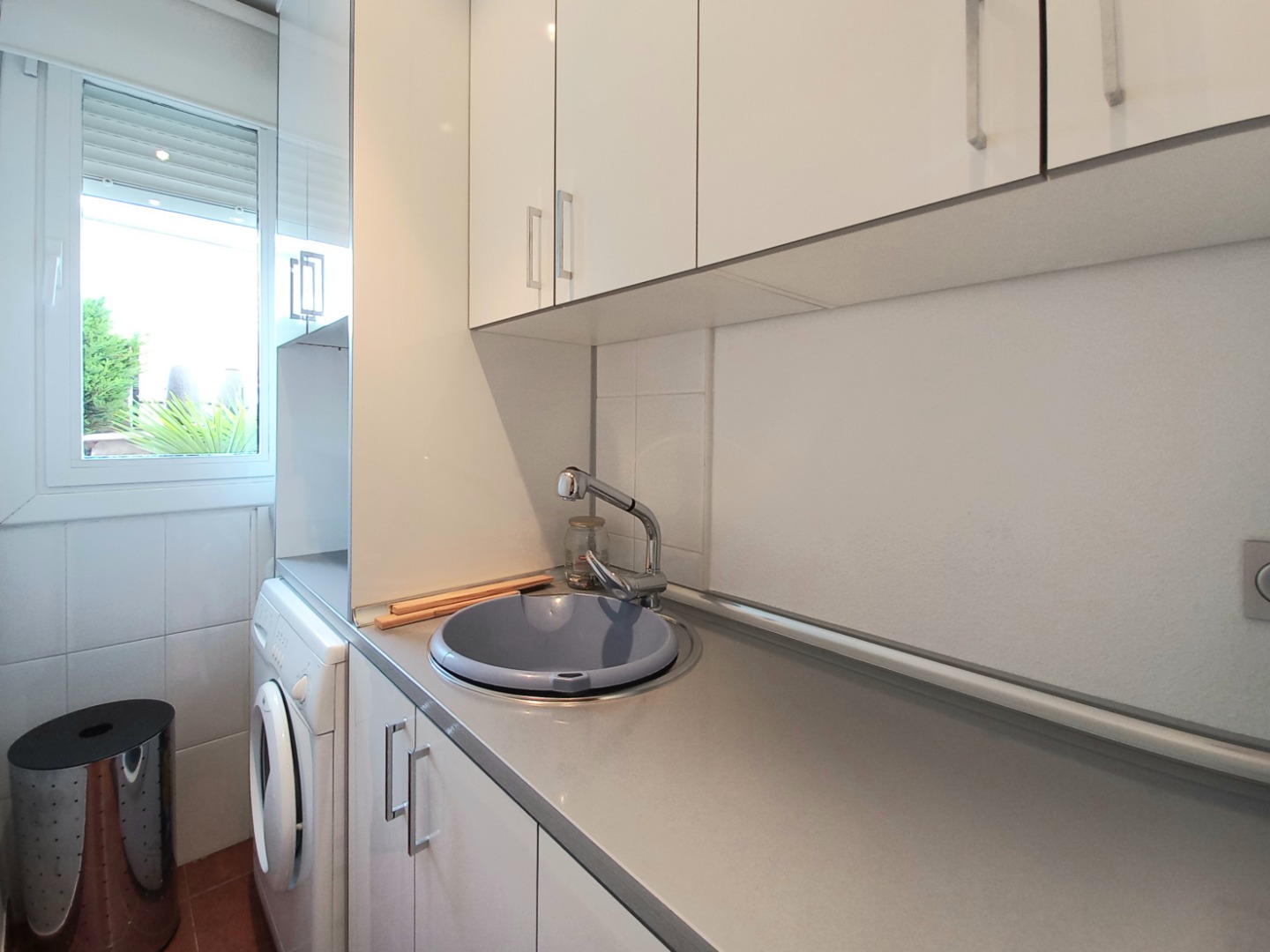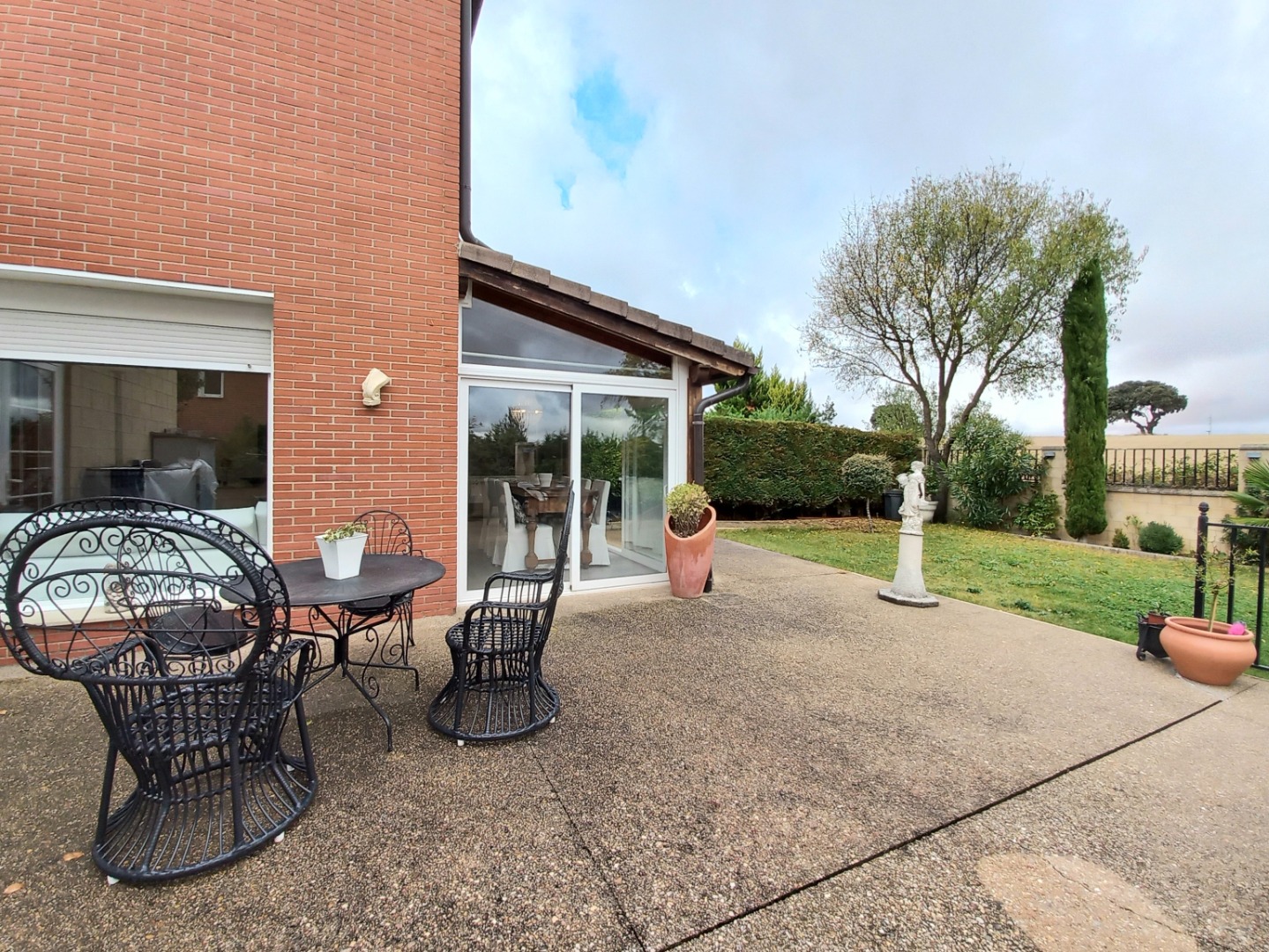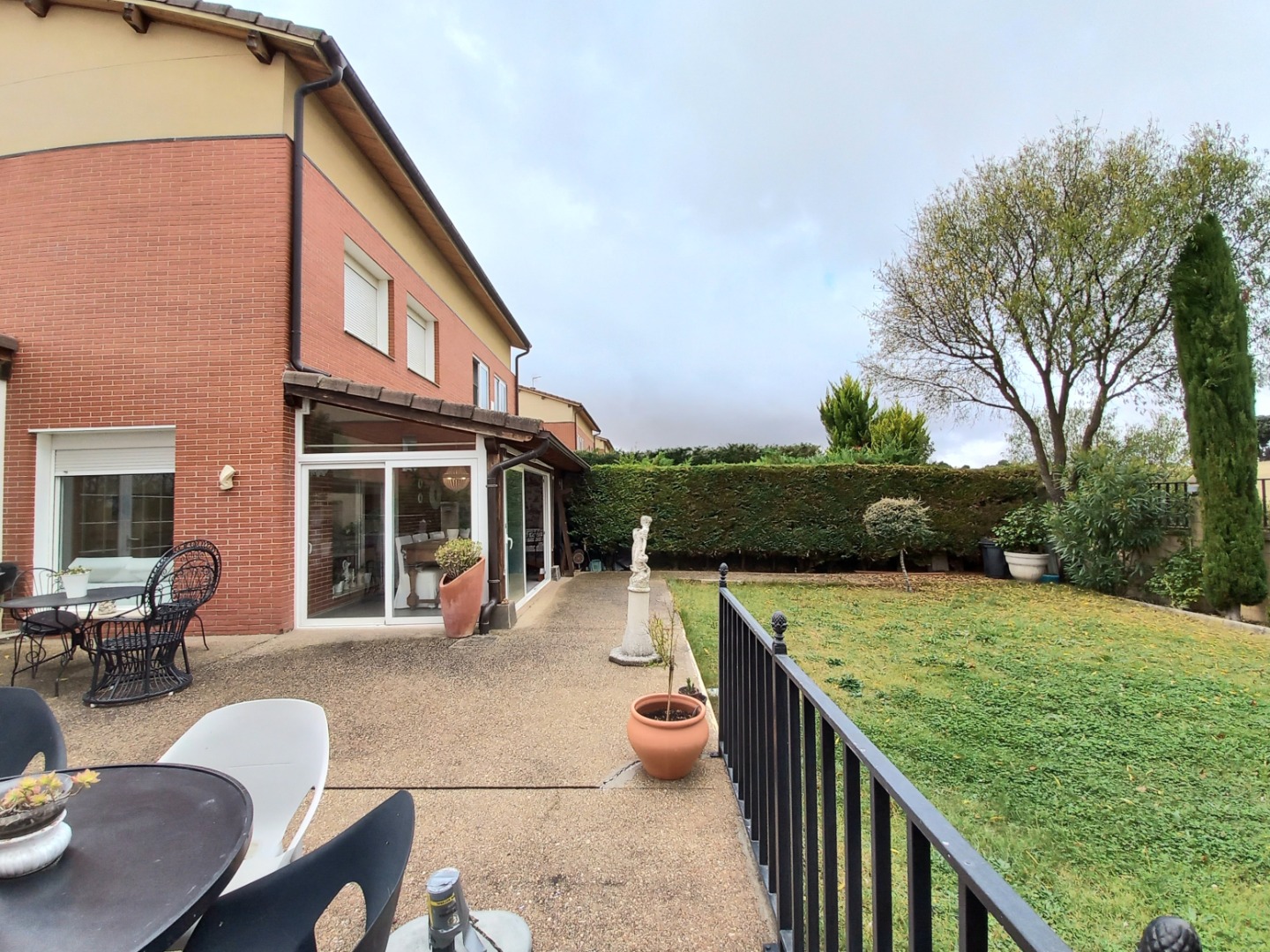 El exterior de la propiedad incluye un garaje privado techado con capacidad para dos vehículos y un maravilloso jardín con instalación de riego automático.