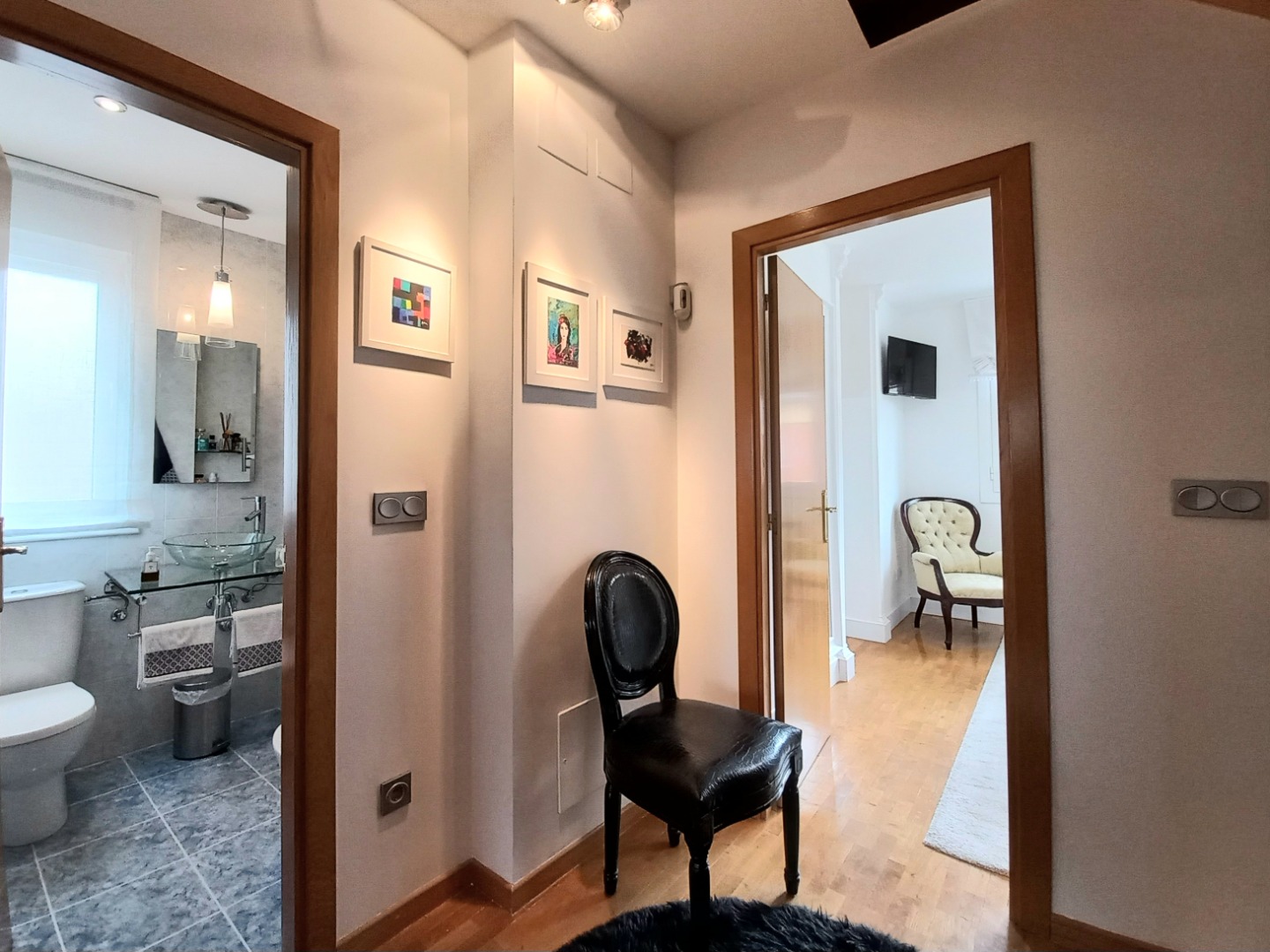 En la primera planta hay tres dormitorios y dos baños. La suite principal cuenta con un vestidor privado y un baño. Se completa la planta con otro baño de cortesía.
