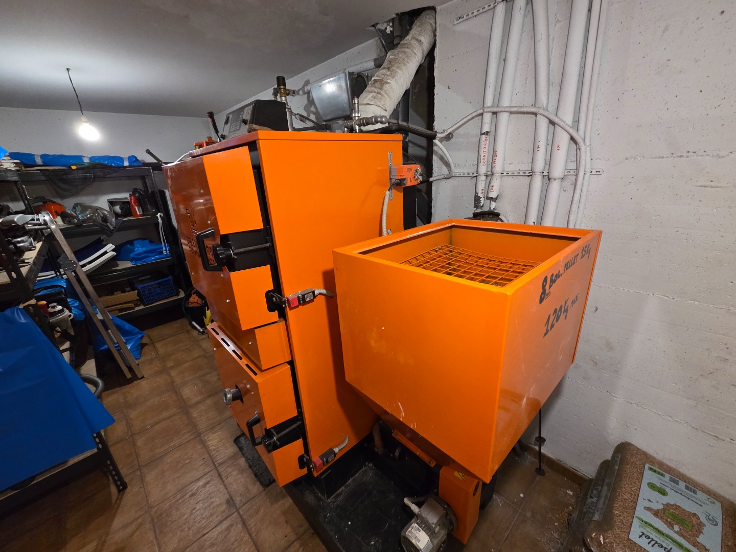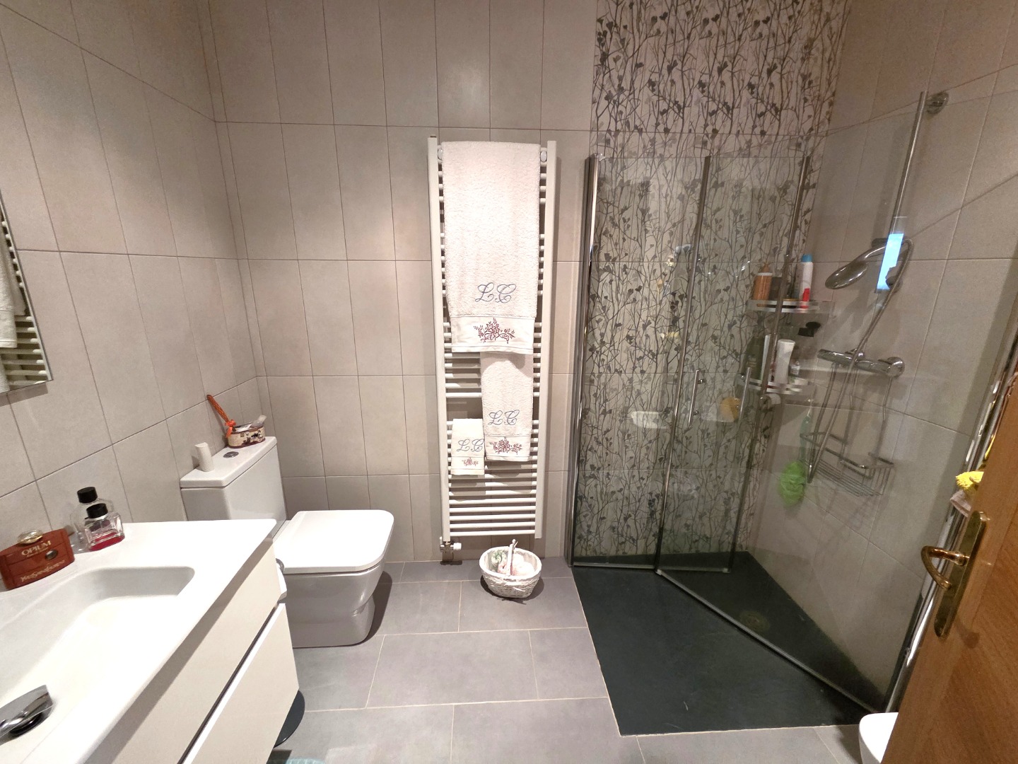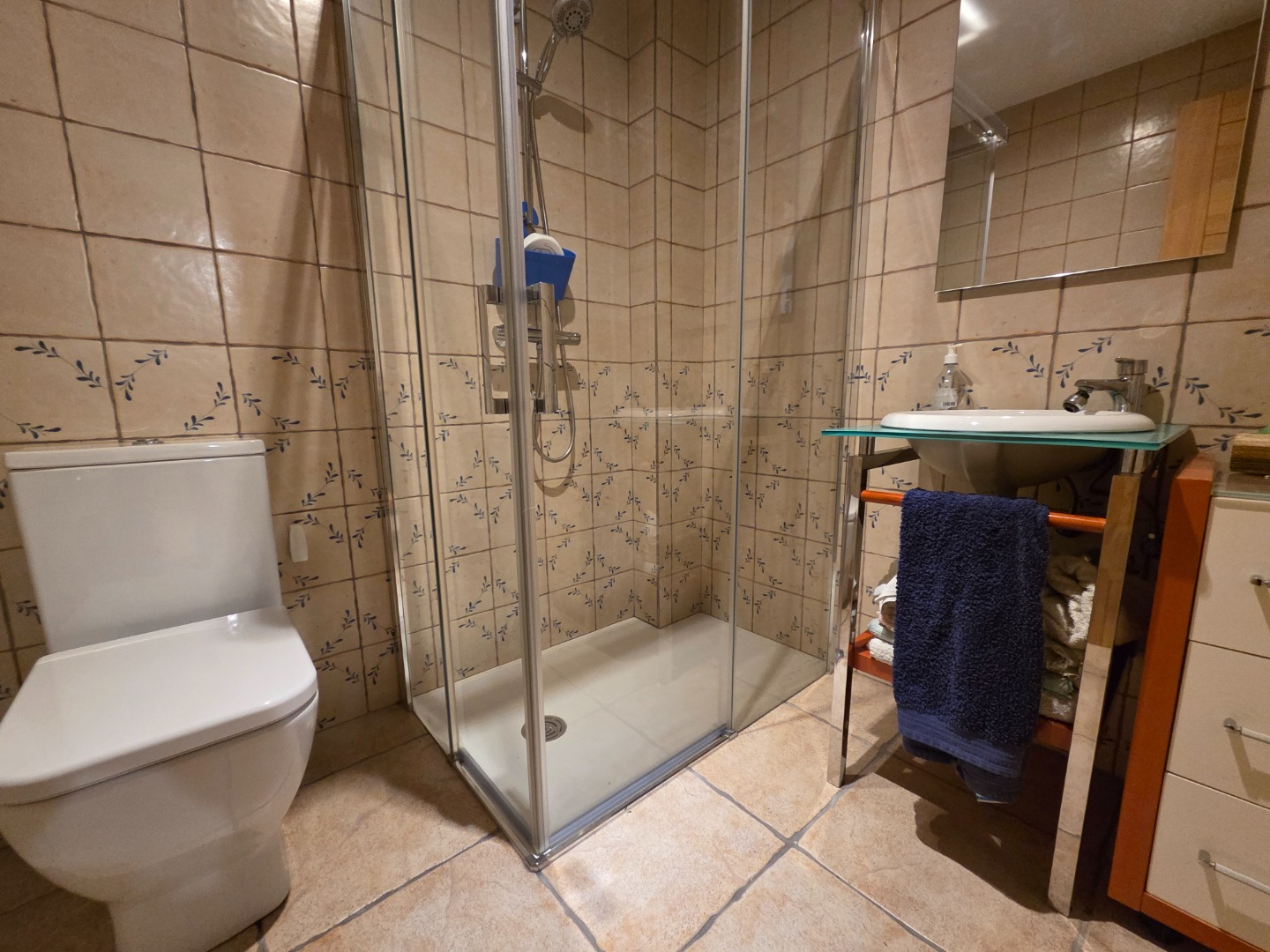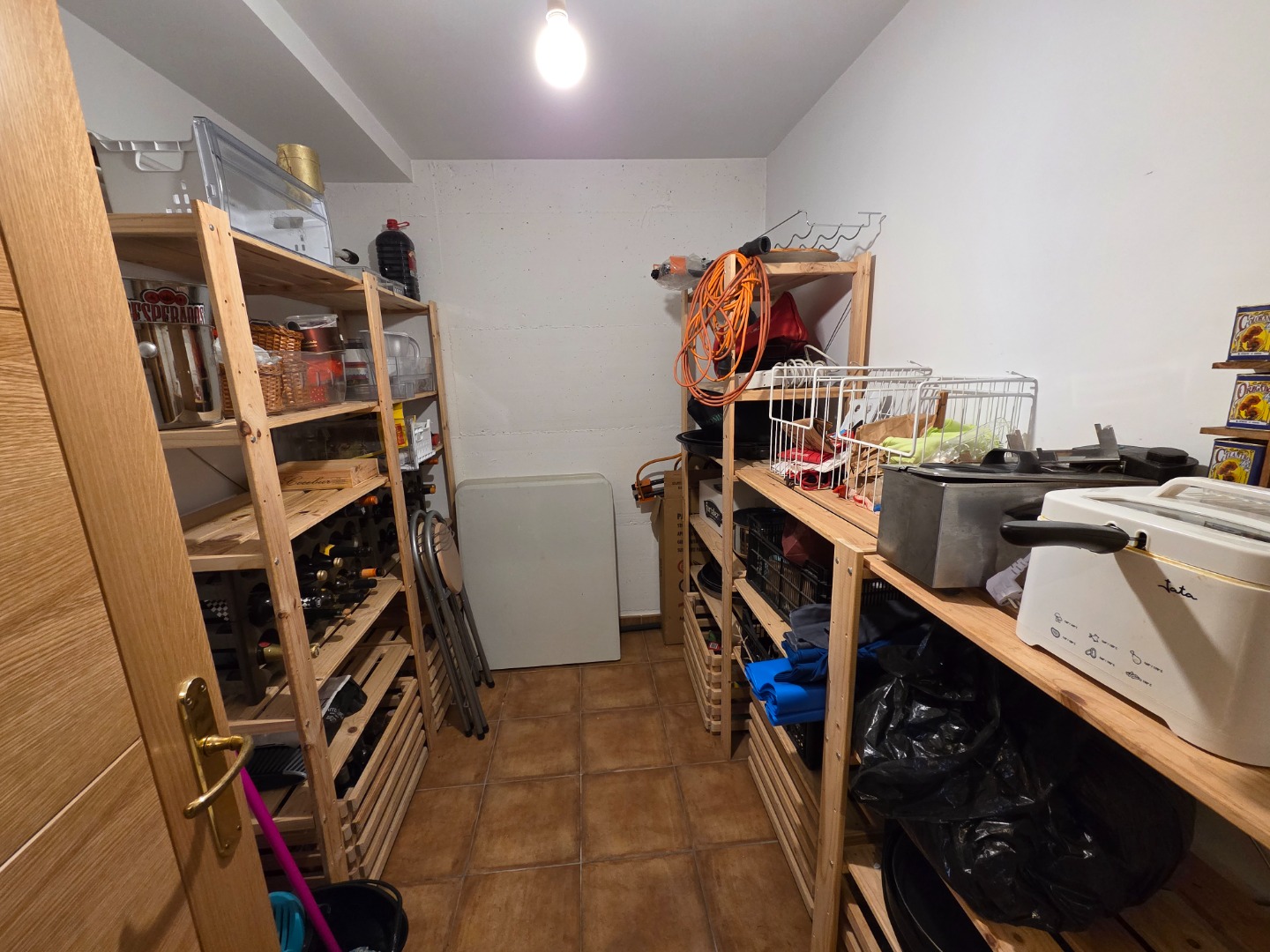 En la parte de abajo de la parcela nos encontramos con un solárium y otra zona destinada a bodega-merendero con chimenea, cocina amueblada y equipada, habitación grande y baño completo con plato de ducha, además de un trastero y sala de calderas de pellets o leña.