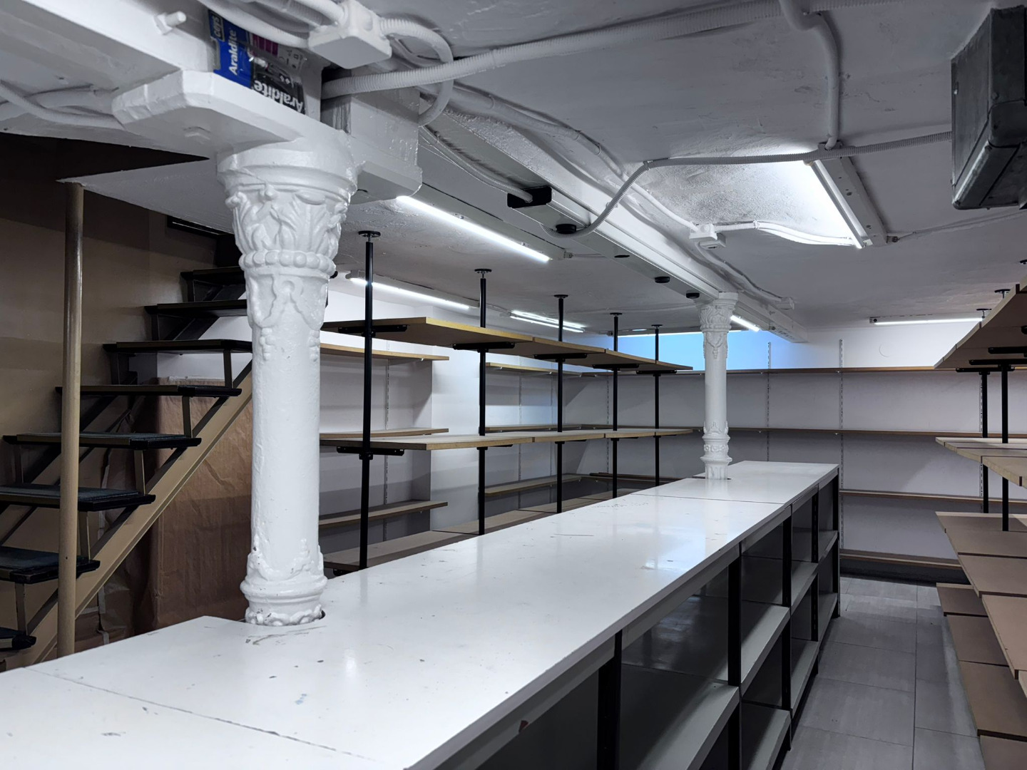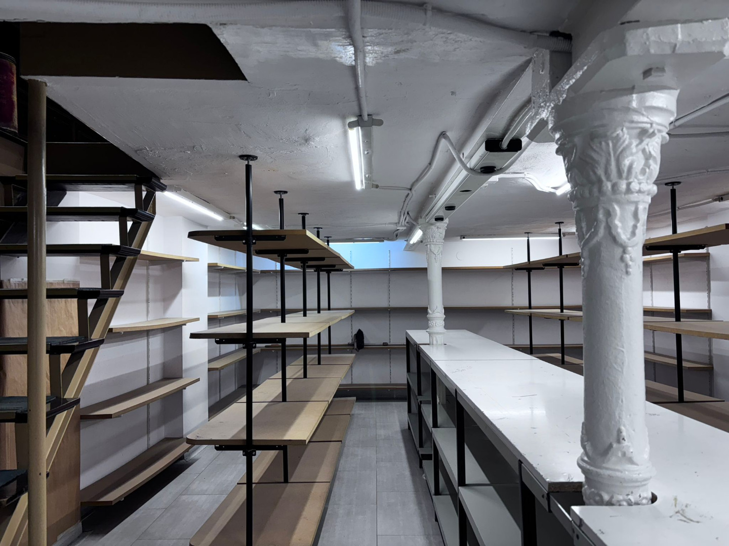 Sótano, un espacio singular de almacenamiento que conserva pilares y capiteles de hierro forjado vistos.