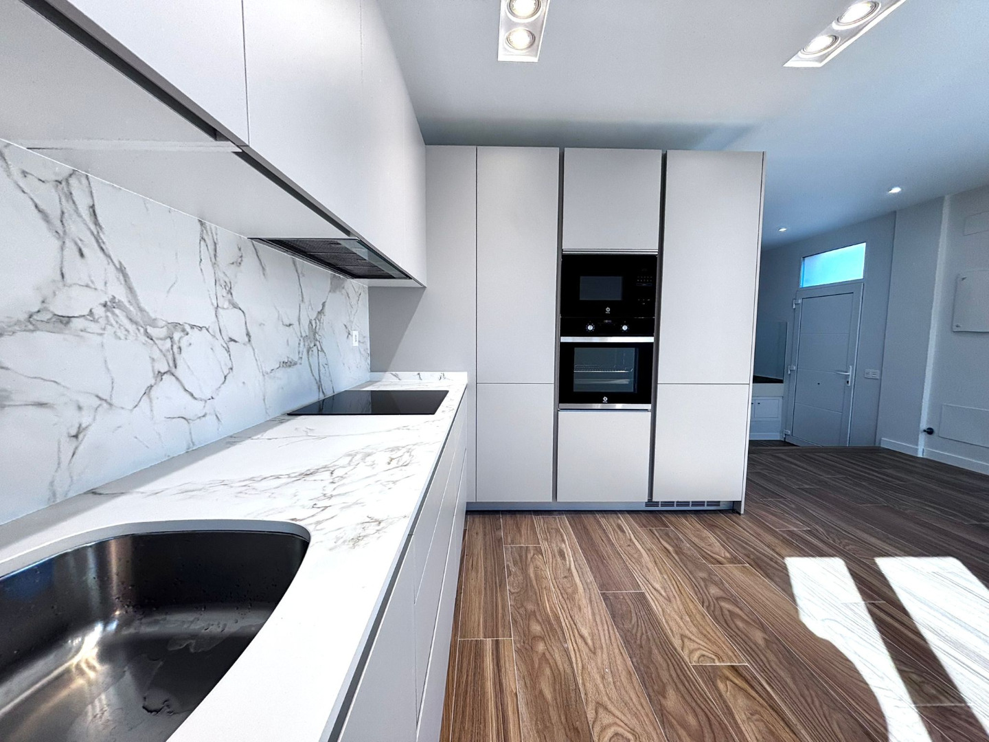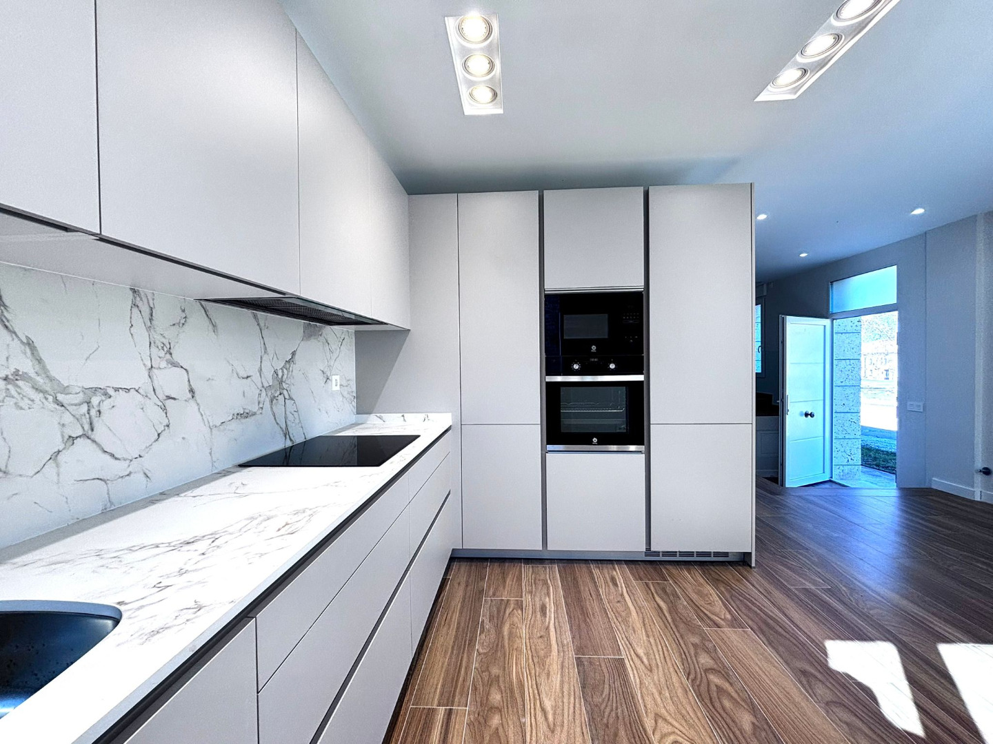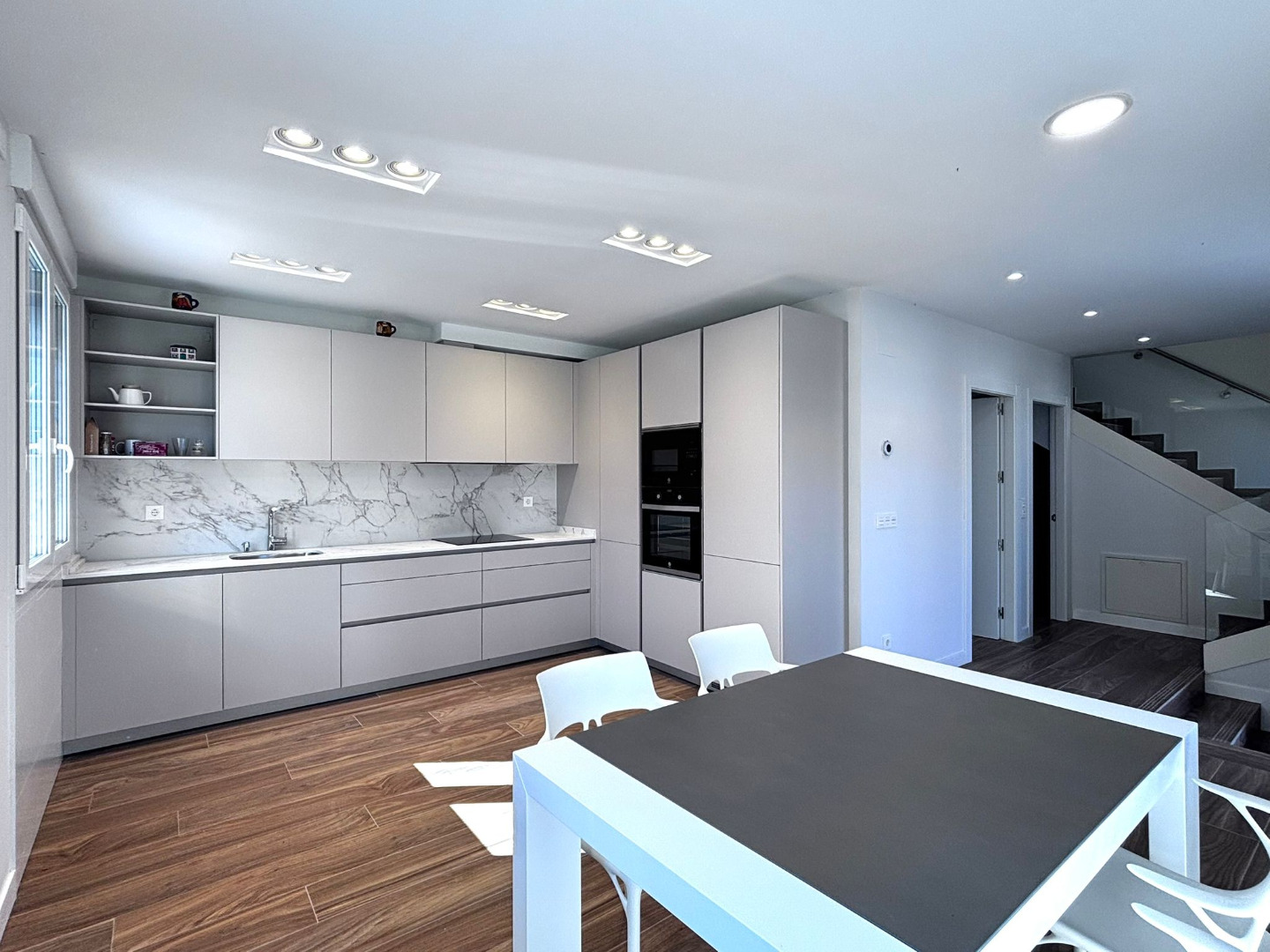Hall con cocina amueblada a estrenar y salón abierto en un espacio lleno de luz y bonitas vistas junto a la iglesia y el parque. Baño completo de PORCELANOSA, cuarto trastero y garaje cerrado automatizado con suelo gres porcelánico rectificado espesorado para grandes cargas.
